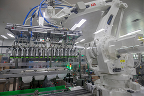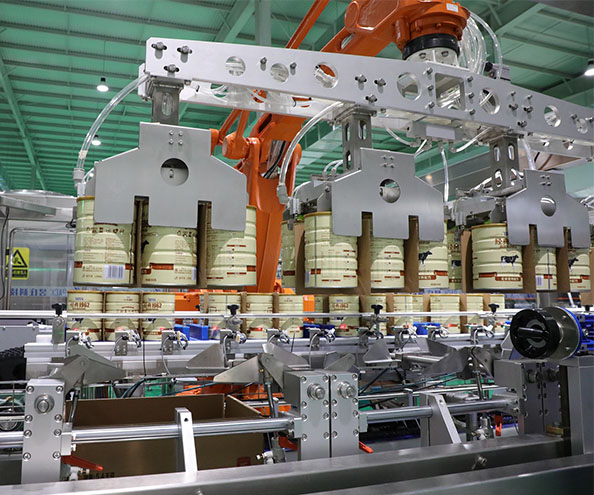 機器人裝箱機采用機器人裝箱,通過更換夾具,使其適合不同包裝物的裝箱需求,極大的提高了設備的靈活性、穩定性和可靠性。