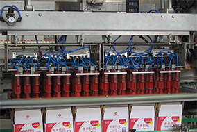 機械式裝箱機通過抓頭充氣、放氣來實現產品的抓取和放置動作。通過雙四連桿機構完成瓶子的提升、移動和降落。為了節省非工作時間,在空載回程時快速移動以提高生產效率。機械式裝箱機廣泛應用于瓶裝產品的預制箱包裝。